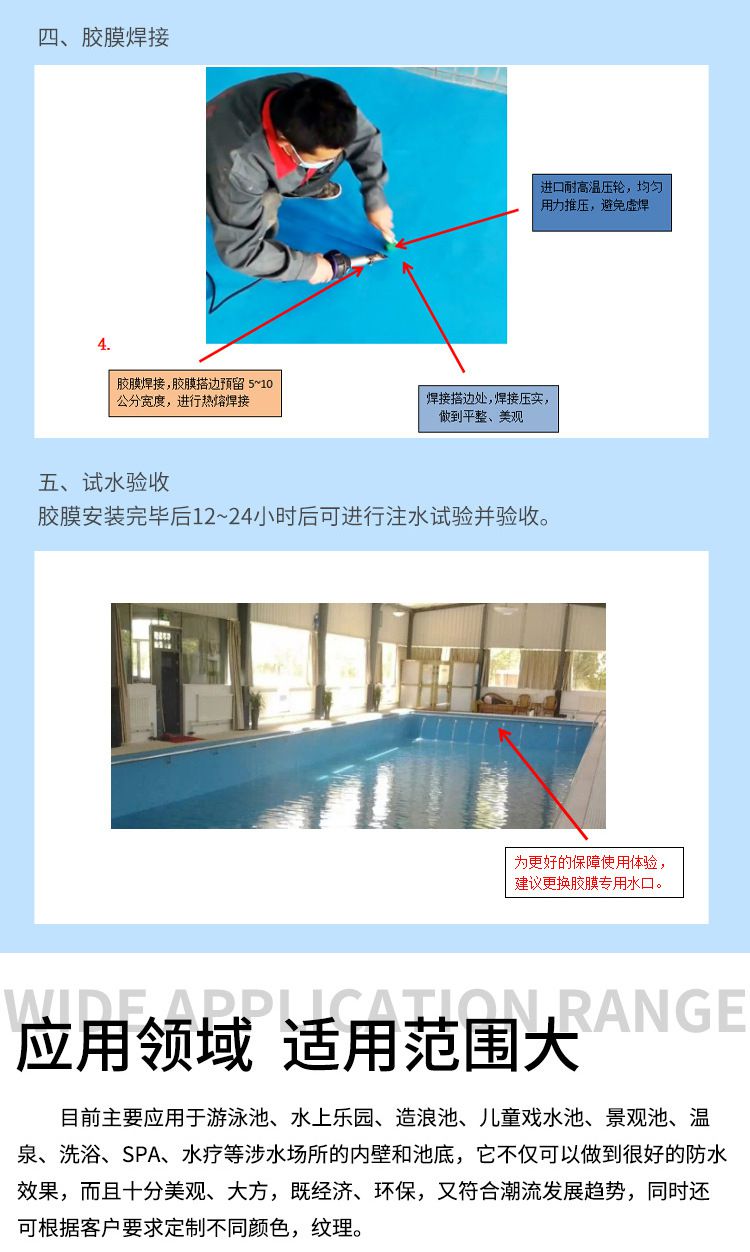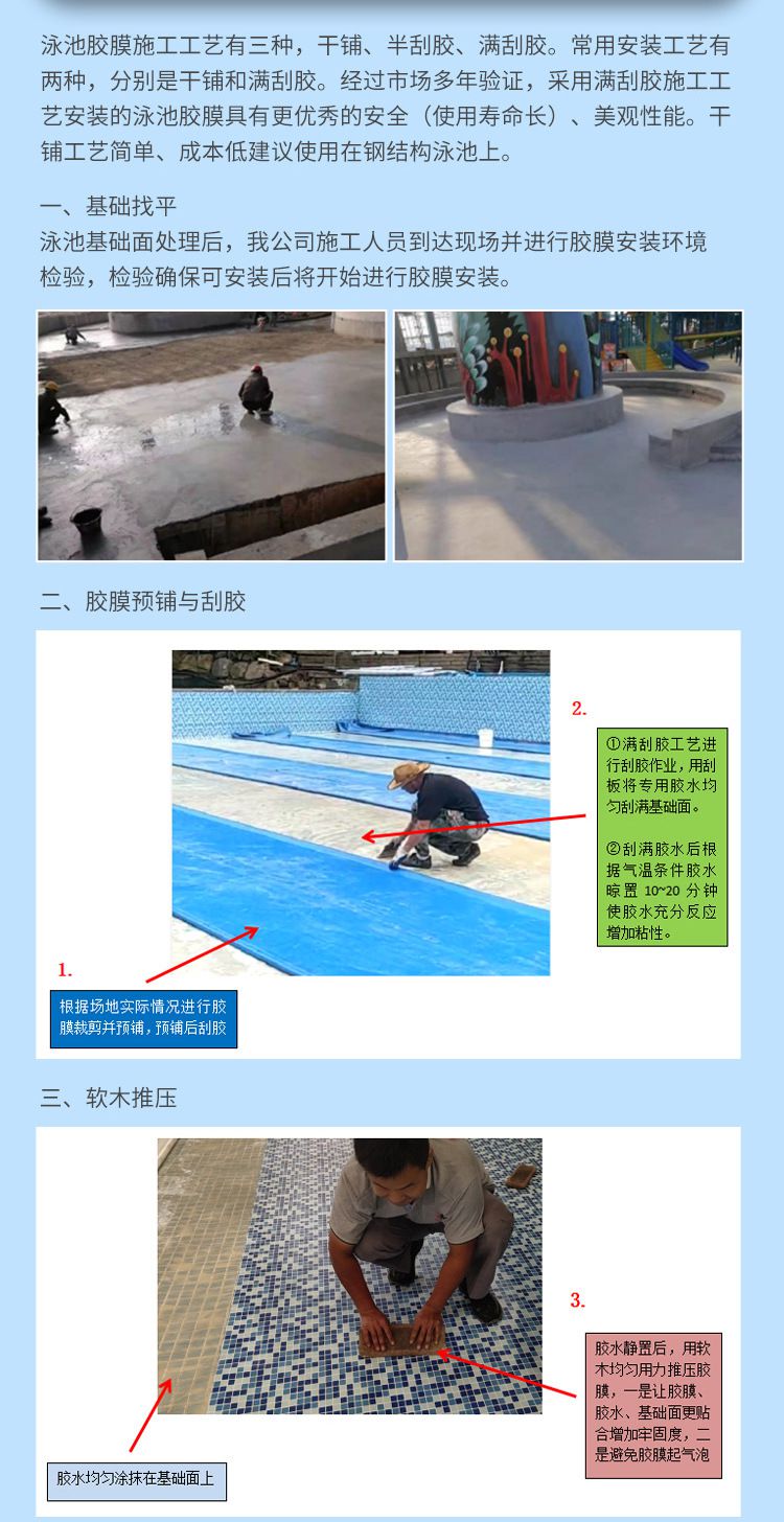 想必這樣,朋友們應該對游泳池膠膜的工藝以及施工方法流程有更清楚的了解,自己施工一定要注意細心,尤其是池內陰角以及拐角處的處理。只有注意好每一個施工環節,游泳池膠膜施工做下來才能達到理想的效果。